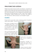 Milivoj Jovančević i suradnici • Godine prve: zašto su važne PRVA POMOĆ KOD GUŠENJA Katkada strani predmet ili hrana iznenada zatvori dišni put i onemogućava ili značajno otežava disanje. Kod potpunog zatvaranja dišnog puta dijete ne može kašljati niti proizvesti bilo kakav zvuk, tek široko raširenih očiju pokušava udah- nuti i ubrzo počinje plavjeti u licu. Kod nepotpunog zatvaranja, javlja se gušeći kašalj popraćen ponekad piskutanjem pri teškom i dugom udahu. Događaj je vrlo dramatičan i zahtijeva neodložnu pomoć osobe koja je toga trenutka uz dijete. Vaša smirenost i odlučnost značajno će povećati izglede za uspjeh! DOJENČE Provjeriti vidi li se strano tijelo u ustima i odstraniti ga prstima. Ne pokušavati tragati za njime naslijepo – može ga se pogurnuti dublje! Poleći dojenče na podlakticu svoje ruke – potrbuške, glavom naniže i 5 puta udariti dlanom po leđima između lopa- tica. Ako predmet ne bude izbačen, provjeriti vidi li se u ustima. Ako da, pokušati ga odstraniti prstima. Ako se ne vidi, ili nije sam ispao, okre- nuti dojenče na leđa, glavom naniže, i prstima izvršiti 5 snažnih pritisaka u području donjeg dijela prsne kosti. 546 Provjeriti vidi li se strano tijelo u ustima. Ako da, pokušati ga odstraniti. Naizmjenično ponavljati ove postupke dok se strano tijelo ne odstrani ili dok dijete ne ostane bez svijesti. U slučaju da ostane bez svijesti i ne diše, započeti s oživljavanjem.